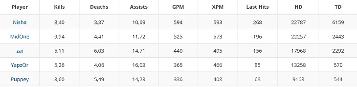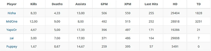 4. Вопросы есть к роли, которую Пуппей отвел Заю. Функции оффлейнера Team Secret включают в себя агрессивный отпуш линий и нанесение урона по зданиям. В среднем на долю шведа приходится 19% от командного урона по строениям, а учитывая долю Ниши больше чем в 50%, это весьма заметный вклад. По этому параметру Зай примерно на равных с Мидваном.