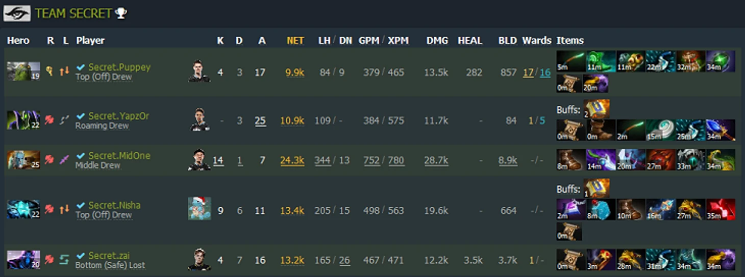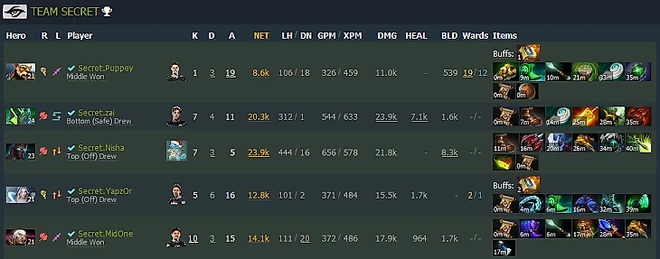 Пуппей знаменит не только экспериментальными драфтами. Оригинальный состав Team Secret включал в себя керри Kuroky и оффлейнера Fly. В прошлом сезоне в оффлейне играл Fata. А сейчас в сложной линии у Клемента играет Zai, которого не менее легендарный капитан ppd видел исключительно в роли четверки.