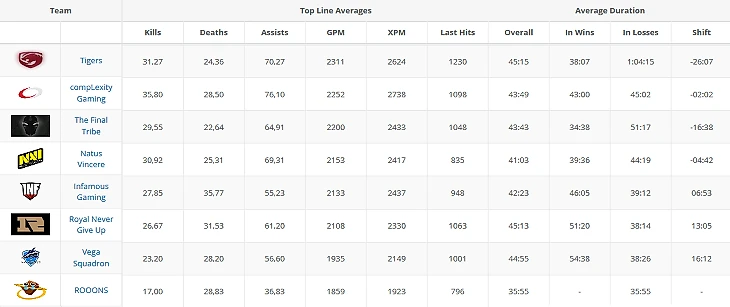 Tigers лидируют по среднему GPM, что неудивительно для команды с самым высоким процентом побед. Здесь интереснее другая цифра – средний крипстат. Игроки Tigers добивают в среднем больше 27 крипов в минуту, с гигантским отрывом опережая другие команды (для сравнения: у Na`Vi – 20, у RNG –23,5).