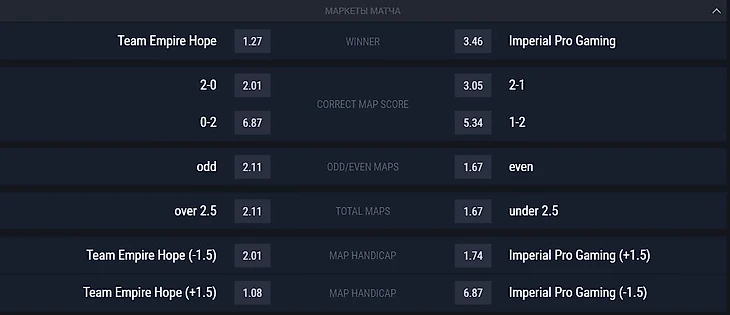 1)Team Empire Hope - Imperial Pro Gaming ф2(+1.5) за 1.74