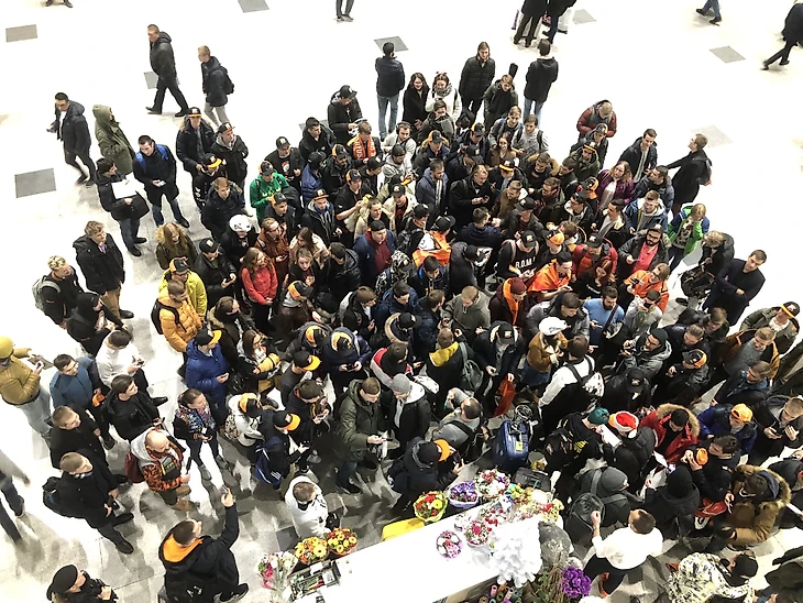 Обидно что мерча хватило не всем. Кому-то достались лапы VP, кому-то бейсболки, кому-то флаги. Со старым дизайном!!!! Это было обидно. Расстроило отсутствие репортёра от данного сайта. Конкурент снял какой-то развлекательный ролик. Кстати, бредовая идея. Люди в 6 утра пытались смешно пошутить.
