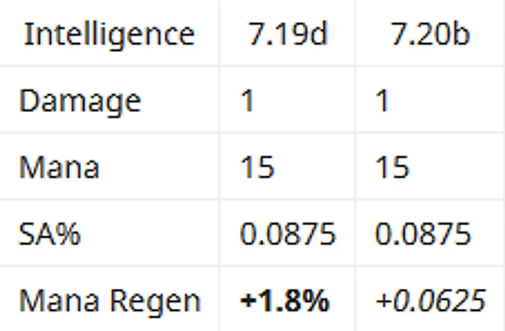 Если раньше реген маны увеличивался в процентах от Интеллекта, то сейчас везде абсолютные цифры. Талант на регенерацию маны на 10-м уровне раньше усиливался от Интеллекта, сейчас он всегда дает одинаковый бонус. Раньше бонусы Шторма от Интеллекта росли экспоненциально, теперь это в прошлом.