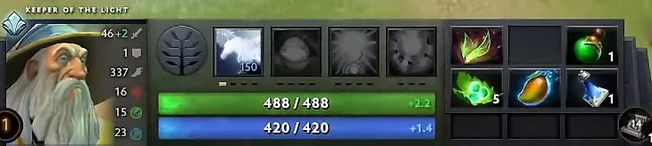 Никаких статов, лишь расходники. Это единственно верное решение для героя, геймплей которого заключается в постоянном пуле крипов и периодических Illuminate по линии.