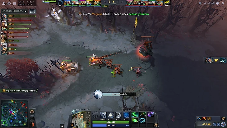 8:40 – важнейший момент игры, которого могло бы не быть без ошибки Gh. Они с Майнд_Контролом выходят на MK, но из-за неправильного направления Blinding Light Crystallize отлетает прямо к Ораклу, который его спасает. Казалось, что драка безнадежно проиграна, но Na`Vi напрочь забыли про правильный приоритет целей и накинулись на Омнинайта.
