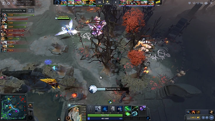 1:00 – идеальный старт для Liquid. Natus Vincere использовали связку Tusk+Oracle. Работает так: Tusk использует Tag Team, Oracle накручивает,а потом бьет несчастного атаками. Сила в том, что у Оракла самая высокая базовая скорость атаки. Третий герой абсолютно неважен – связка уничтожает почти любого оппонента в новом патче, и во многом из-за нее команды вспомнили, что в доте необязательно стоять 2-1-2. Как и в играх против LGD, Na`Vi сделали ставку на доминирование в оффлейне. Они не были готовы к тому, что Huskar возьмет первую способность на первом уровне, а KotL задует Illuminate на 200 урона по каждому. Обратите также внимание на Healing Salve, который GH использовал на Хускара.