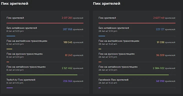 Слева расположена статистика турнира, который проводился в Малайзии в 2017-м, а справа – в 2018 году. Пиковое количество зрителей на англоязычных трансляциях упало в два раза, а максимум на Facebook отставал от прошлогоднего рекорда Twitch на 136 тысяч.