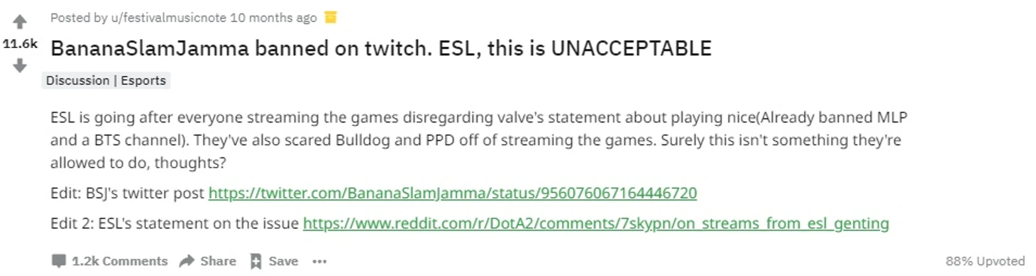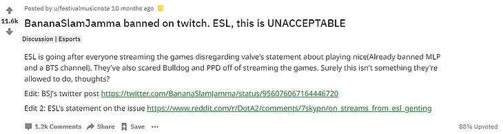 Само собой, отток зрителей с официальных трансляций не шел на руку Facebook и ESL. Тогда компании решили банить пиратские стримы. Одной из жертв стал канал BSJ, что сразу вызвало бурную реакцию сообщества. Посвященный этому тред стал седьмым по рейтингу за год и набрал больше тысячи комментариев.