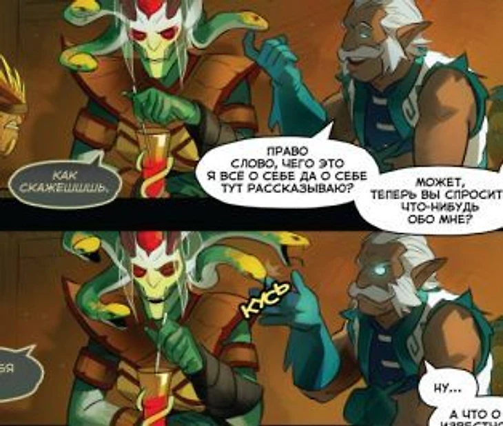 Еще один комикс связан с выпуском предметов качества Immortal перед началом The International 5. В нем объясняется, как герой Enigma получил свои золотые браслеты, кардинально меняющие анимацию ультимативной способности Black Hole. По отзывам подавляющего большинства – в лучшую сторону. Ссылка на комикс.