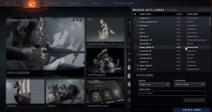 Лобби в Dota 2 – это определенная игровая функция, которая позволяет сыграть приватный матч с выбранными вами людьми. При этом за игру не начисляют очков трофеев, она нигде не учитывается, в ней не выпадают вещи. В лобби можно войти, если ввести пароль, который установил хост или же создать лобби самому. Если нет пароля, то в лобби можно войти только к другу или согильдейцу. Вы можете перейти в любую команду, если свободны слоты, можете занять слот комментатора или просто наблюдать за игрой. В лобби можно добавлять ботов на любой слот или же закрыть его, а также активировать автобаланс, что позволит вам более-менее сбалансировать уровень игроков в командах. Присутствует настройка игры – вы можеет выбрать кто будет первым пикать в ЦМ моде, сколько будет бонусного времени, тип серии игр (1,2,3 матча), включить читы, заполнить все пустые слоты ботами, разрешить или запретить наблюдателей, включить общий чат и установить задержку.