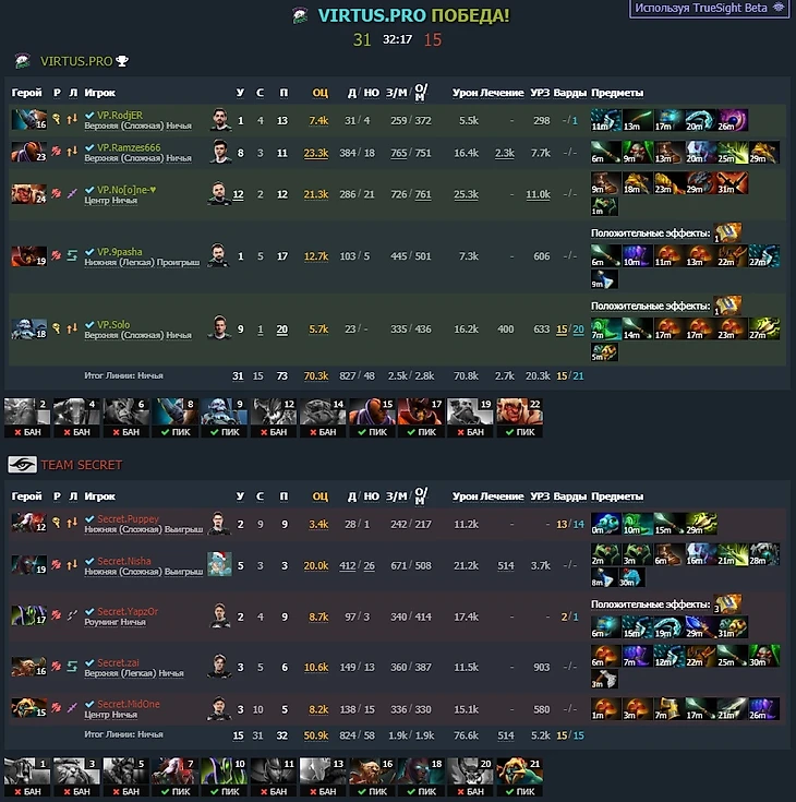 Игроки VP смогли убить Нишу и отправились на Рошана, однако там с ними расправилась оставшаяся четверка Secret. Итог – gg.