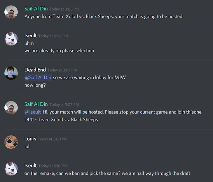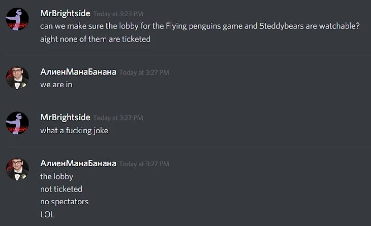 С ними еще хуже. Одна команда не могла попасть в лобби, т.к. бот залагал и не пригласил игроков в лобби. Пароль же найти было невозможно – ни на сайте ESL, ни где-либо еще. Понадобилась куча времени, чтобы достучаться до админа и выбить из него пароль.