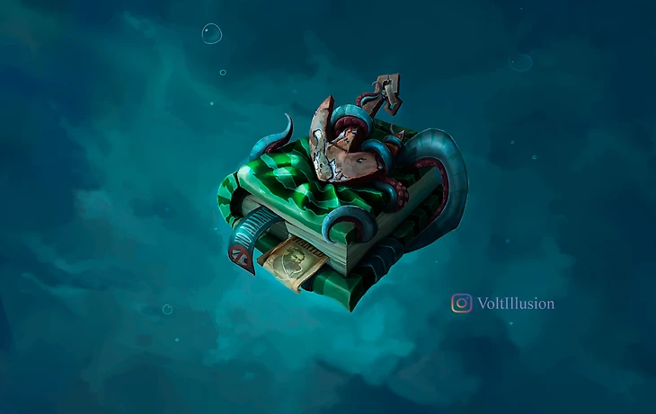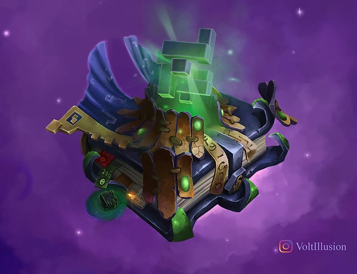 Среди работ Артема есть сундук с картами из Artifact. Конечно, паки в игре выглядят по-другому, но этот концепт мог бы стать для них достойной заменой.