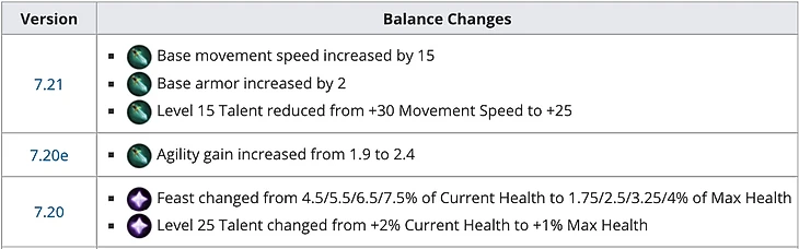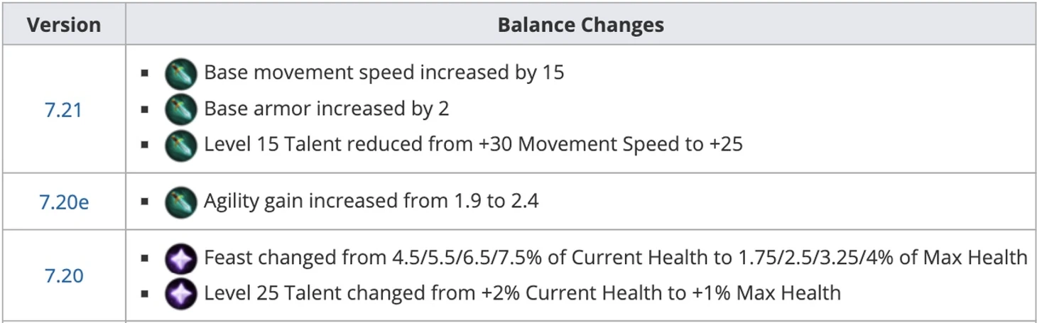 2 патча подряд Лайфстилер получает усиления. Все эти изменения укрепили его позиции в начале игры: с 2,9 армора можно уже хоть как-то стоять на линии, переработанный Feast увеличивает урон по «жирным» героям врага, а больший базовый мувспид позволяет как эффективнее убивать героев противника, так и спасаться от гангов.