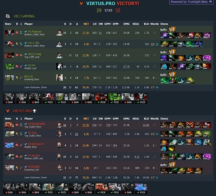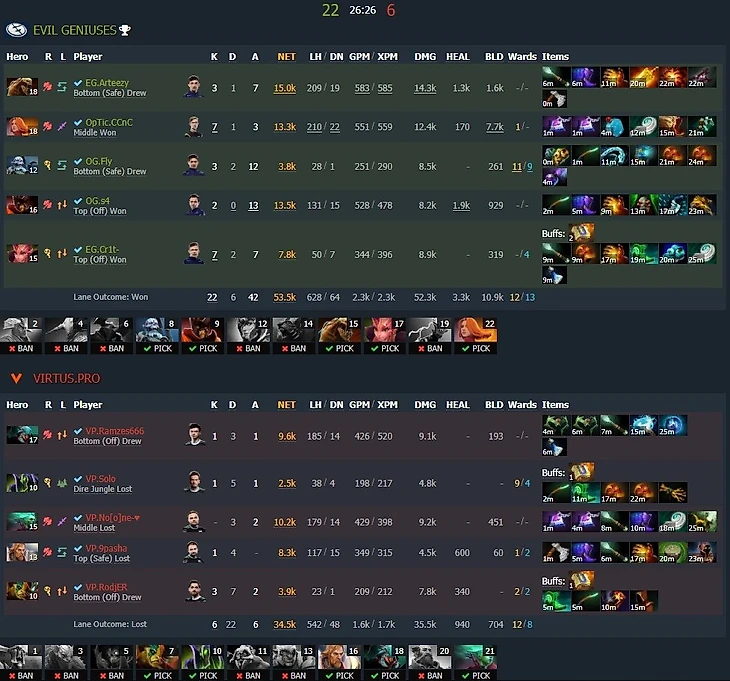 Стоило EG получить преимущество, они начали давить. Ганги, Рошан, удачные драки – герои VP умирали снова и снова. Наша команда сдалась на 27-й минуте.