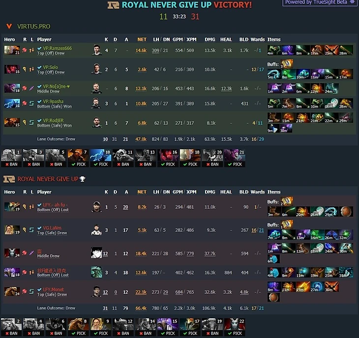 В этот раз проблем в миде у VP не было, но страдали другие линии. Агрессивная трипла прогнала Рамзеса с легкой, и ему пришлось смещаться на топ. Благодаря мобильному пику китайцы активно гангали, перетягивались и конратаковали.