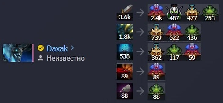 За карту Daxak отметился неплохим уроном по Пангольеру, одиночным фрагом на нем и... все. Вот его статистика урона: