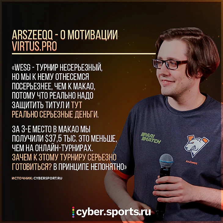 Конечно, Арсзика спросили, такой же ли этот турнир несерьезный, как MDL Macau, на котором игроки Virtus.pro играли в Apex во время драфта, гоняли медведя, а сам Арсзик призывал болеть за Gambit на параллельном турнире в Катовице.