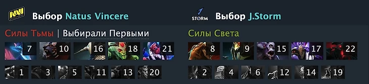 Начали Na`Vi с распика Лешрак-Урса. Первый является метовым героем в принципе, а также обладает универсальностью в плане позиции. Второй же считается сигнатурным для Кристаллайза: на про-сцене Владислав сыграл на нем 18 игр с винрейтом 72% и KDA 5.46. Штормы во второй стадии взяли ВД для усиления контроля по Урсе, а Natus Vincere почему-то решили ответить Свеном. Возможно, не хватало инициации, да и Warcry мог бы пригодиться, но будучи что саппортом, что оффлейнером, Мятежный Рыцарь слаб на линии и имеет ближний тип атаки, что делает Вич Доктора еще сильнее. Дарк Сир также усилил потенциал пятерки J.Storm, а СФ был взят под достаточное количество контроля и для поддержания давления. Natus Vincere пикнули сигнатурную Медузу и Дизраптора, чтобы бороться с ДС'ом и улучшить файт-потенциал.