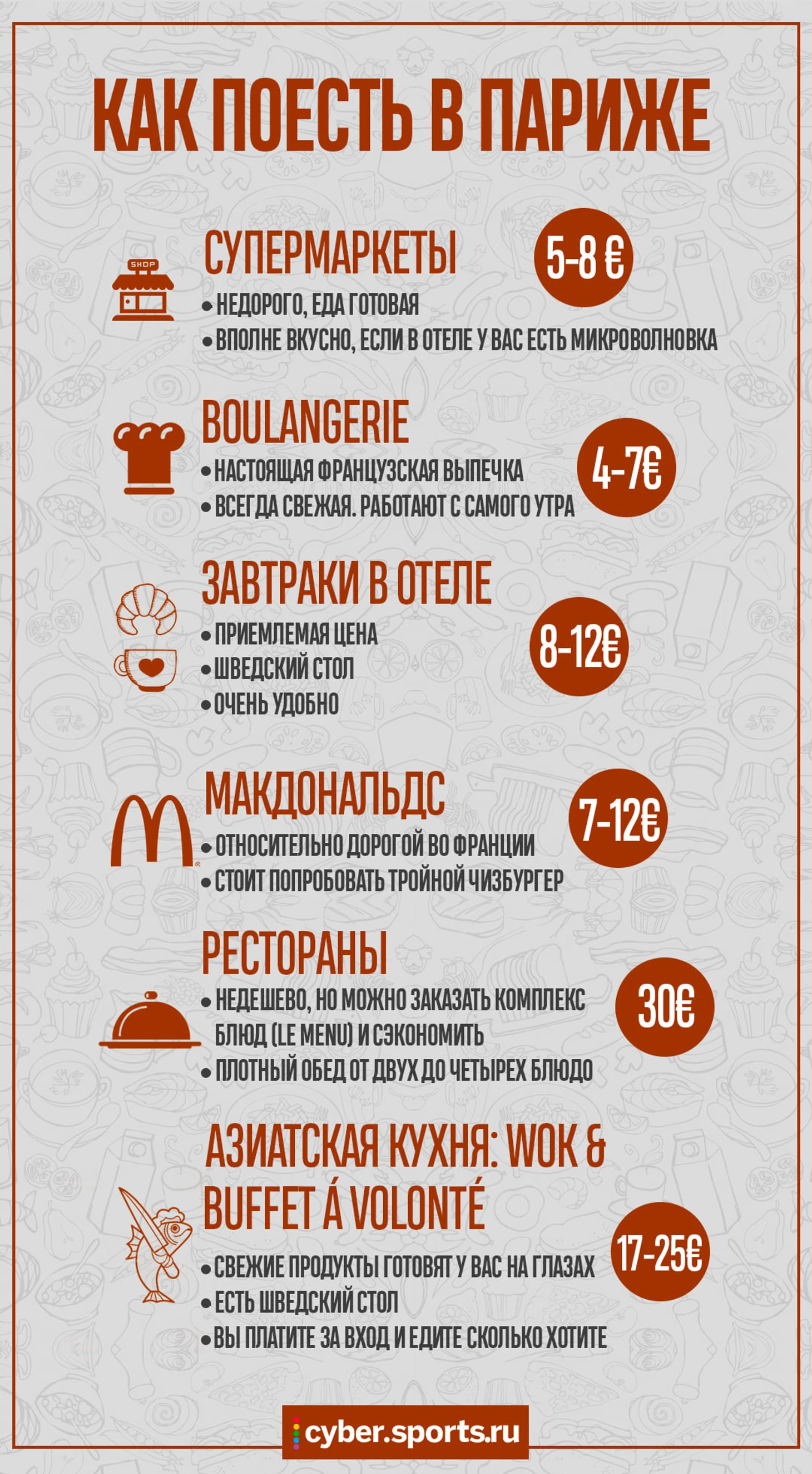 Например: прилет во вторник, доехать до Парижа – 12€. 4 дня турнира, дорога Париж – Диснейленд – 8 в обе стороны билетов по 7.50€. И 10 поездок в метро по достопримечательностям города по 1.90€.