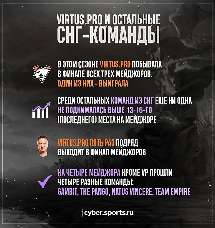 Что делать? Если бы кто-то знал ответ, то давно бы его реализовал. А пока в СНГ страдают все – и VP, которым жизненно необходимо хоть иногда отдыхать от пристального взгляда сотен тысяч русских и украинских зрителей, и другие команды, которые не могут сражаться с VP за слот на мейджоре, и зритель, которому не за кого болеть, если VP чем-то его не устраивает.