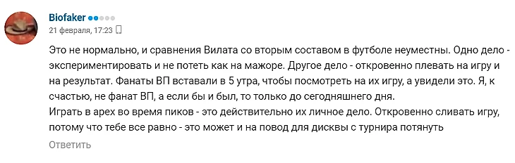 Тренер говорит, что команда экспериментирует и просит не ждать серьезных результатов на второстепенном турнире (VP займет там третье место)? Неважно – недовольны даже аналитики и комментаторы.