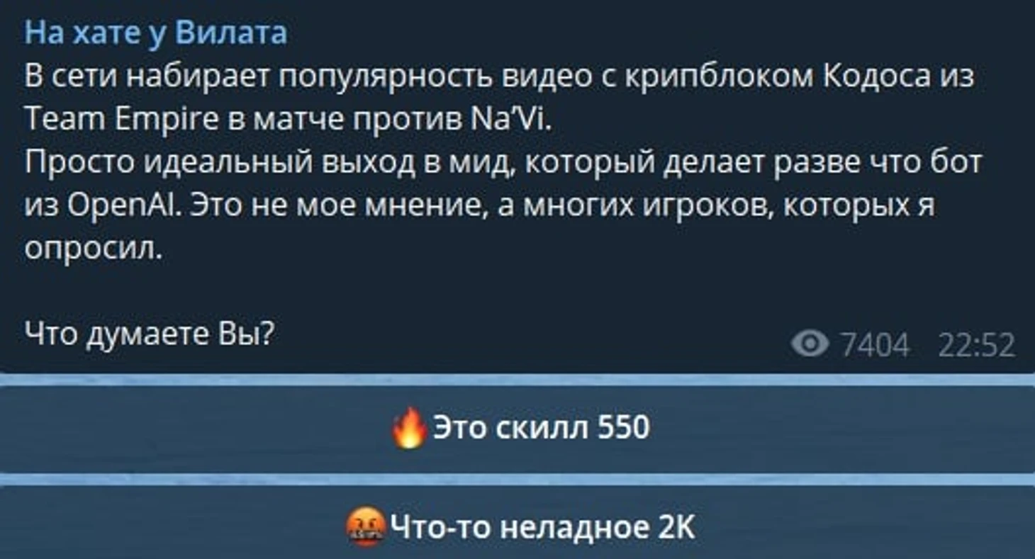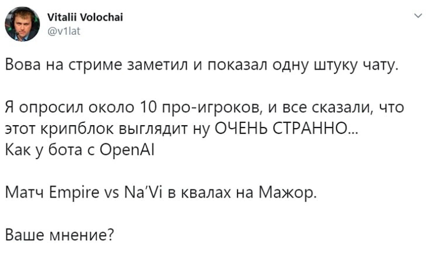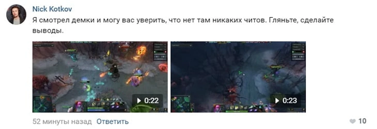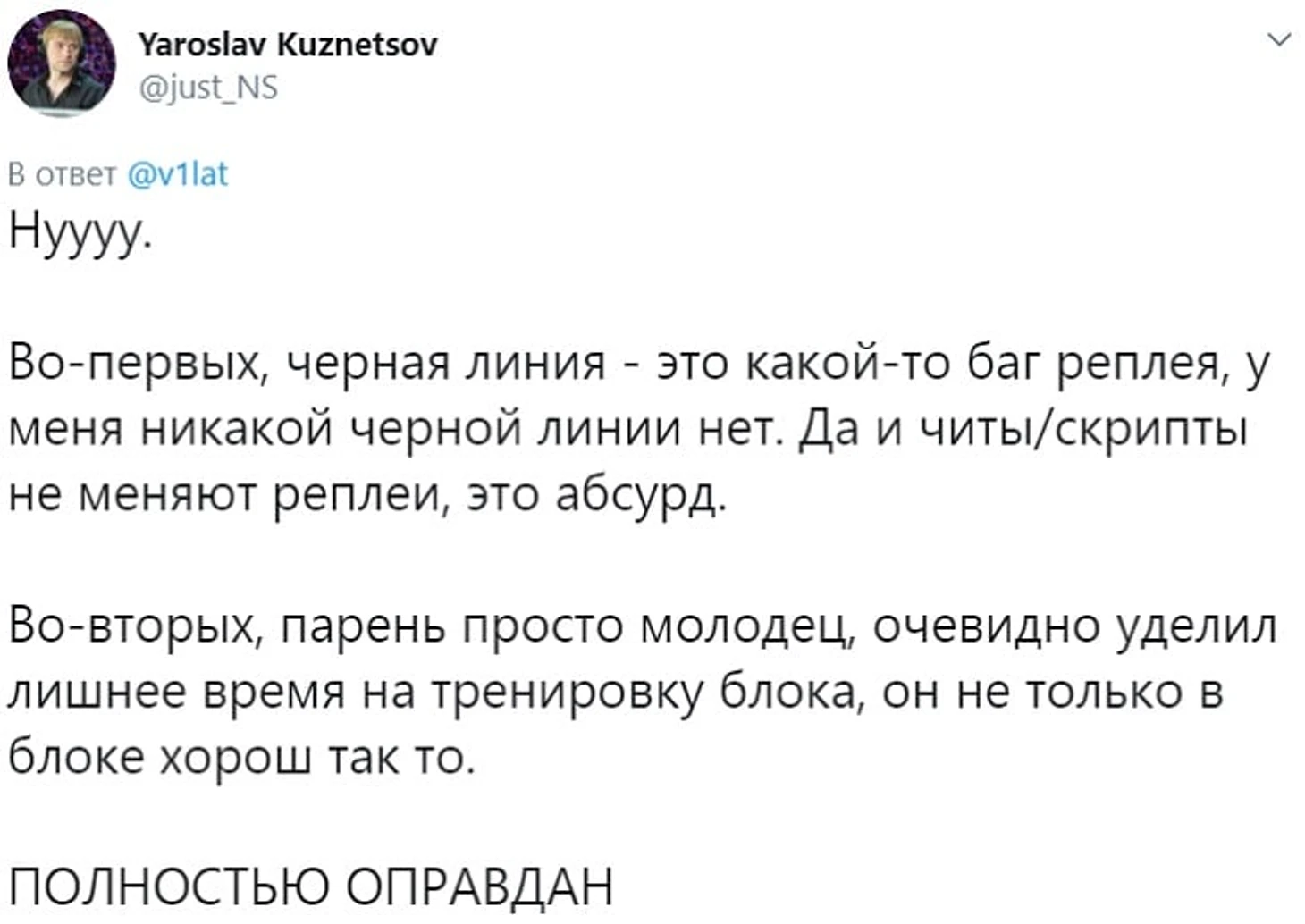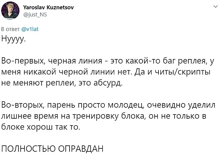 И пусть v1lat пишет в ответ на этот твит: «Ну пгг ж никого не обвиняет. Просто смотрит реплей на стриме», из записи слов не выкинешь. Еще раз: цитата Владимира Аносова: «Оп, мышка залагала и теперь у него курсор другой. Дойдет до мида и она пропадет», на что ему ответят «Да, Вов, это читы», и он согласится с этим мнением. Да и формулировки Вилата определенно подталкивают к стороне обвинения: