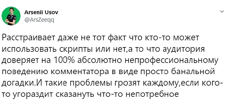 NS в телеграме высказал очень правильную мысль: «Ярлык навесить очень просто, а рядовой зритель порой разбираться не станет. У него будет примерно так «Где-то кто-то сказал про читы, фиг его знает кто и где, но я вроде слышал, что этот парень читер» и все». Arszeeq лишь углубил эту мысль, подчеркнув, что сообщество готово верить любой медийной личности без каких-либо серьезных пруфов: