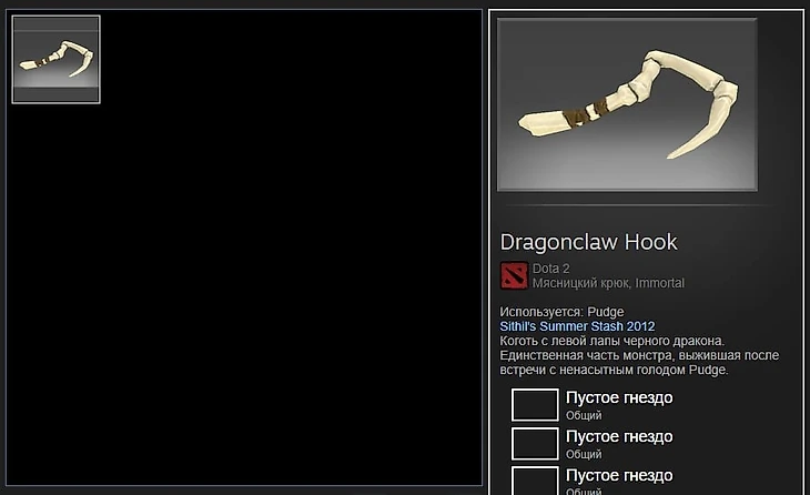 Все эти предметы безумно редкие. Некоторые из них почти невозможно получить в игре: например, Dragonclaw Hook выпадает только из двух сокровищниц в доте, и последняя из них вышла еще в 2016 году. А AWP Dragon Lore хоть и можно с получить после боя, но шанс на это мизерный. Коллекционерам проще ее купить, чем играть тысячи матчей без всякой гарантии на успех или скупать сувенирные кейсы в надежде на удачный дроп.