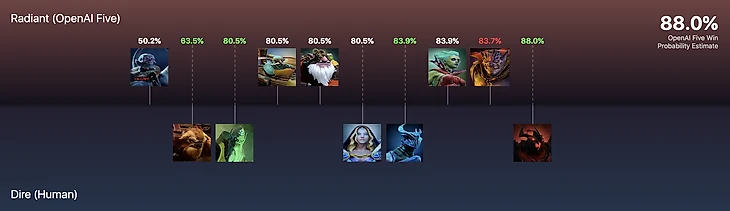 Компьютер оценивает вероятность победы еще на стадии выбора героев. До матча с бывшими про он проанализировал более 11 миллионов различных матчапов, поэтому точно знал, с какими персонажами будет проще победить.