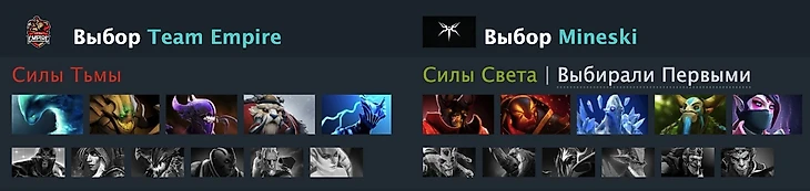 В принципе, пик Имперцев не был так уж плох. Метовые Морф и СК, хорошая пара саппортов Бэйн+Таск, неплохой герой на мид гейм, Разор, который не должен испытывать особых проблем против Темпларки, – все эти герои позволяли играть уверенно. Однако данный драфт зависим от самостоятельного нападения на врага, поскольку в обратном случае оппонент может выключить кого-то Думом, кого-то быстро убьет ТА при помощи тиммейта, и вот уже ты в меньшинстве. Даже при хорошей инициации требуется максимально эффективно потратить все ресурсы (Epicenter, Static Link, Fiend’s Grip), чтобы выиграть драку, особенно на начальных этапах. Тем не менее, эта задача вполне выполнима.