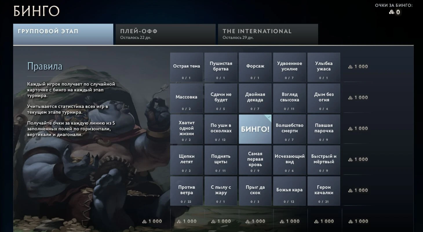 Бинго – на каждый этап турнира вы получаете случайную карточку с событиями. Если событие происходит определенное количество раз (5 раз убили Рошана), одно поле автоматически закрашивается. Когда собирается линия из 5 заполненных полей, вы получите 1000 очков Компендиума. Максимальное количество, которое можно получить за одну карточку, 12,000 очков. Суммарно за весь турнир – 36,000.