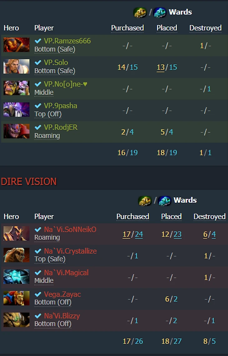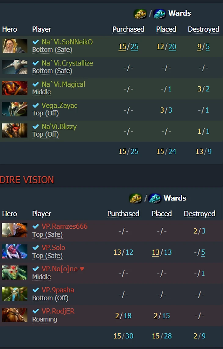 Ни на одной из пяти карт VP не разбила вардов больше, чем Na`Vi. Особенно Solo запомнится четвертая карта – из 15 вардов VP команда Sonneiko разрушила 13! В среднем варды Алексея стояли 1:57, а Роджера – смешные 24 секунды.
