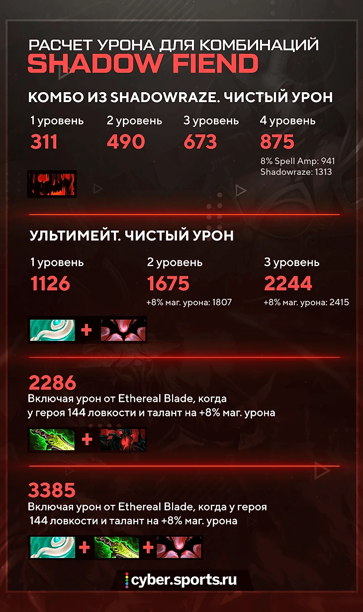 Shadow Fiend – классический мидер, которого стабильно апают уже несколько патчей подряд. Побеждать на нем все еще сложно – за неделю у него 47,8% винрейта. Пользователь реддита Zenkovsan решил помочь любителям Fiend и рассчитал урон от способностей героя на разных уровнях: