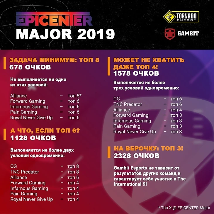 Gambit. Несмотря на скудное 15-е место команды в рейтинге DPC, она все еще может получить прямое приглашение на TI. Команда даже подсчитала исходы, которые к этому приведут: