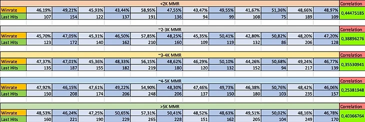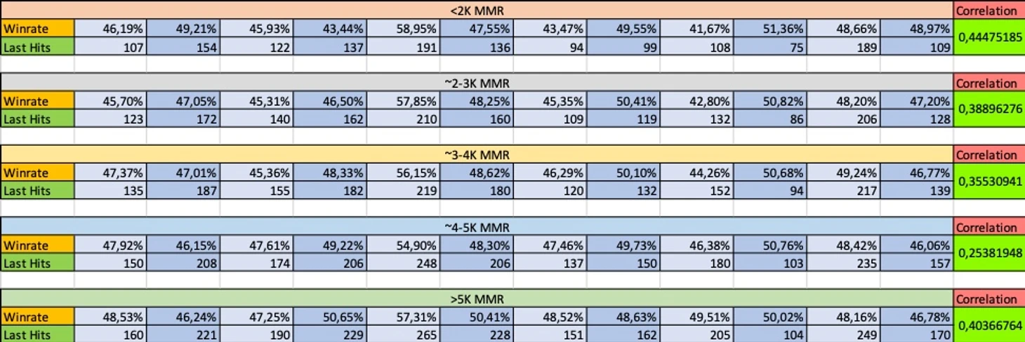 Наивысшая корреляция составляет всего лишь 44%, что совсем немного с точки зрения статистики. Однако, если учитывать, что рассматривается столь комплексная игра, как дота, то можно считать, что зависимость, по крайней мере, выше среднего. Все-таки в доте на исход игры влияют множество факторов, и ласт хиты – лишь один из них. Тем не менее, очевидно, что корреляция снижается до отметки в 4-5K MMR, однако затем повышается до 40%. Из этого можно сделать вывод о том, что существует небольшая прямая зависимость винрейта от крипстата, но на строго определенных рейтингах.