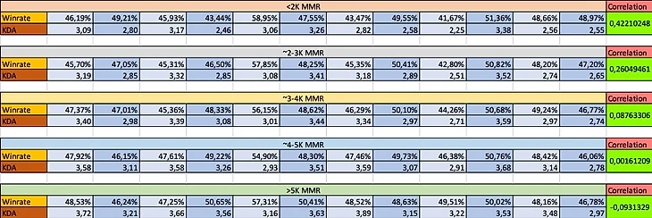 Наиболее интересная ситуация проявляется на 5К MMR. Здесь корреляция вообще отрицательна, то есть чем меньше KDA, тем больше будет винрейт. Впрочем, коэффициент корреляции все равно ничтожно мал, поэтому грубо можно считать, что зависимости так или иначе нет.