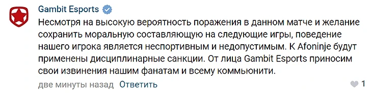 Позднее организация Gambit выпустила официальное заявление о ситуации с Афониным и пообещала наказать игрока.