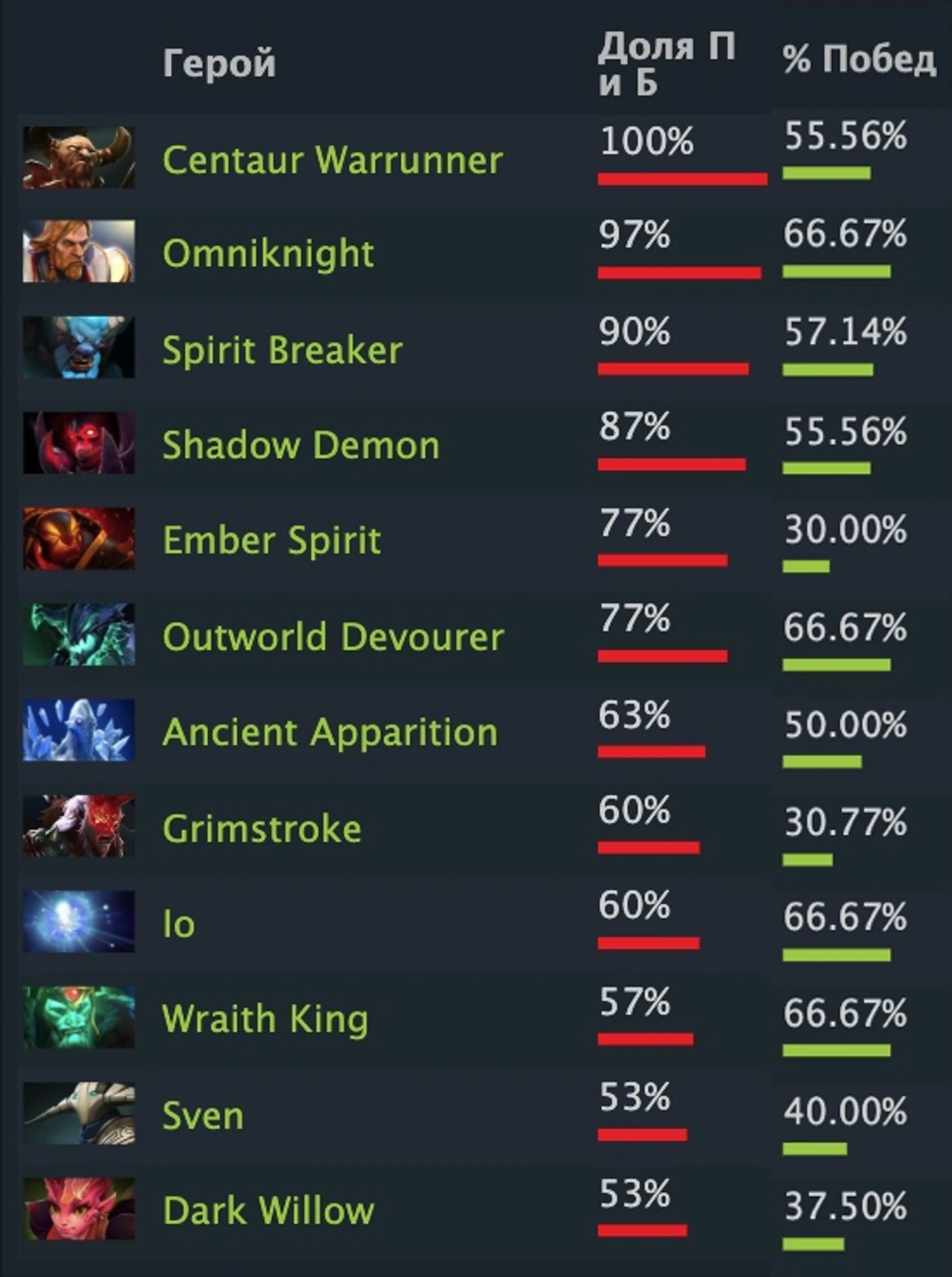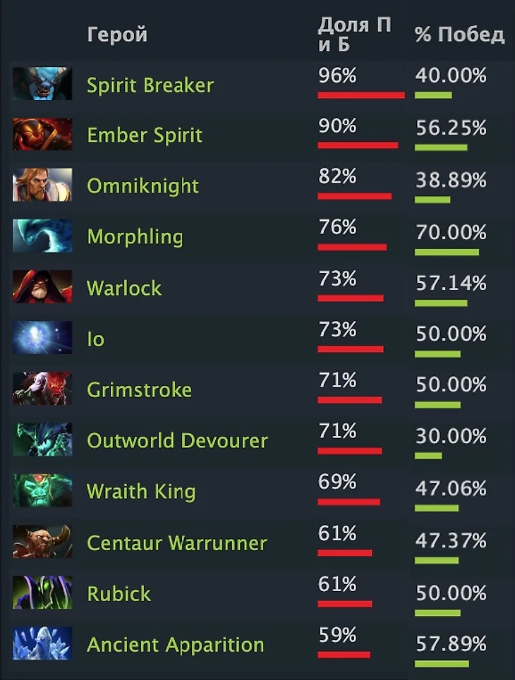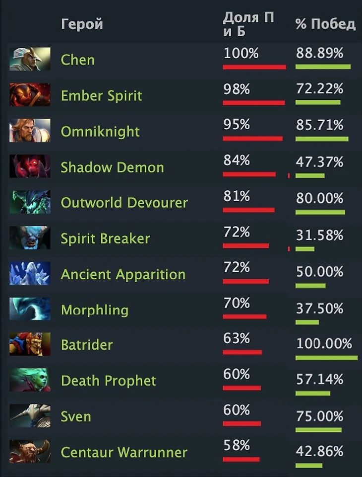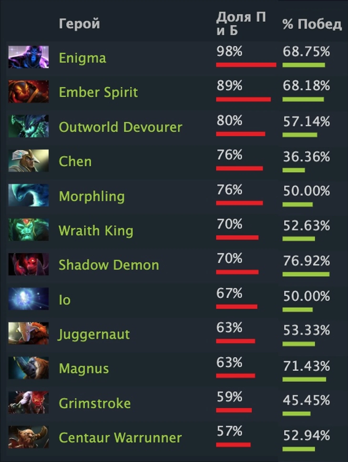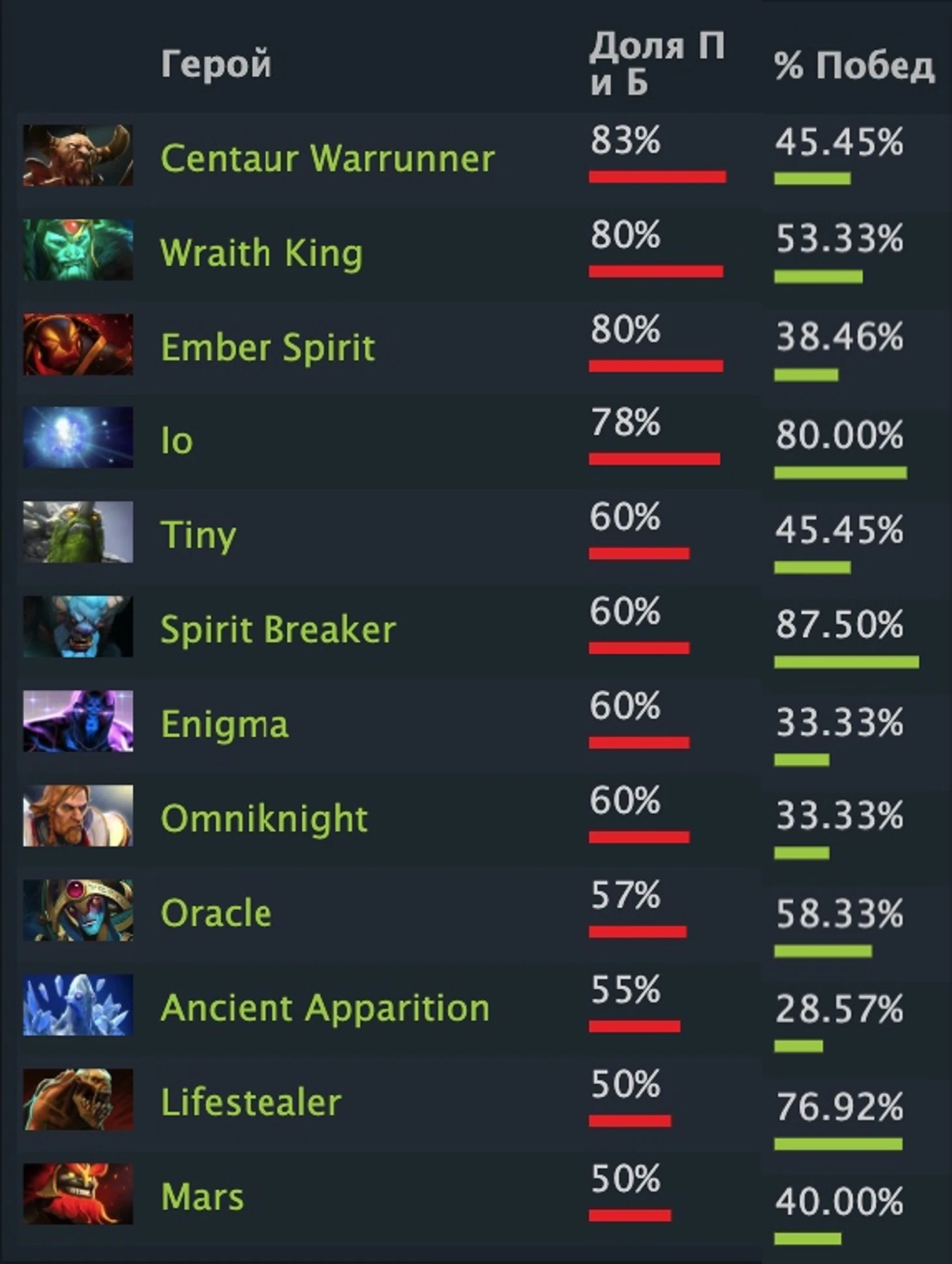 Обращаю ваше внимание, что в колонке «% Побед» указан винрейт, когда герой был в пике, а не комбинированный.