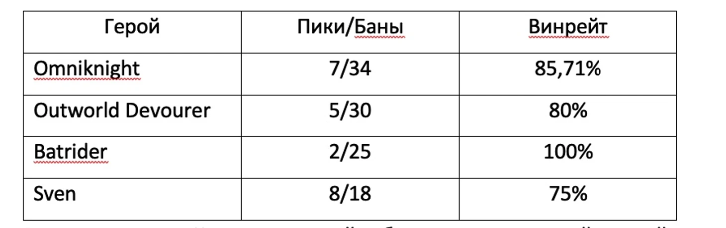 При этом не стоит обращать внимания на высокие винрейты Омника, ОД, Бэтрайдера или Свена, так как их гораздо чаще банили, нежели пикали.