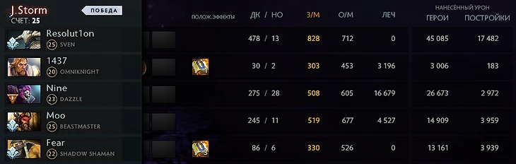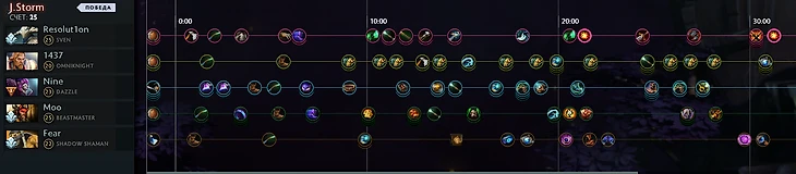 Говоря о Мидасе на Свена, многие до недавнего времени, покрутили бы пальцем у виска, услышав о том, что кто-то покупает этот артефакт на данного персонажа. Многие сборки и раскачки в доте подвержаны моде и большинство людей повторяют всё за про-игроками, не поддавая сомнению их выбор. На первой карте данного противостояния, Резоль не стал покупать всем привычный Мидас, а ровно на 10-ой минуте приобрел Гиперстоун. Если бы он следовал мете, то к 41-ой минуте( именно столько длилась игра), он бы нафармил на 2125 золота больше, чем сделал это с Гиперстоуном, который затем улучшил в Муншард и не дополучил какое-то количество опыта. Так же следует допустить оговорку, что в большинстве игр Свен имеет 6 слотов уже на 35 минуте, а это значит, что Мидас используется еще меньше времени, т.к. возникает необходимость покупки более полезных слотов. Учитывая все это, Резоль не дополучил из-за отсутвия Мидаса 1485 золота. Очевидно, что рентабельность данного артефакта минимальна.