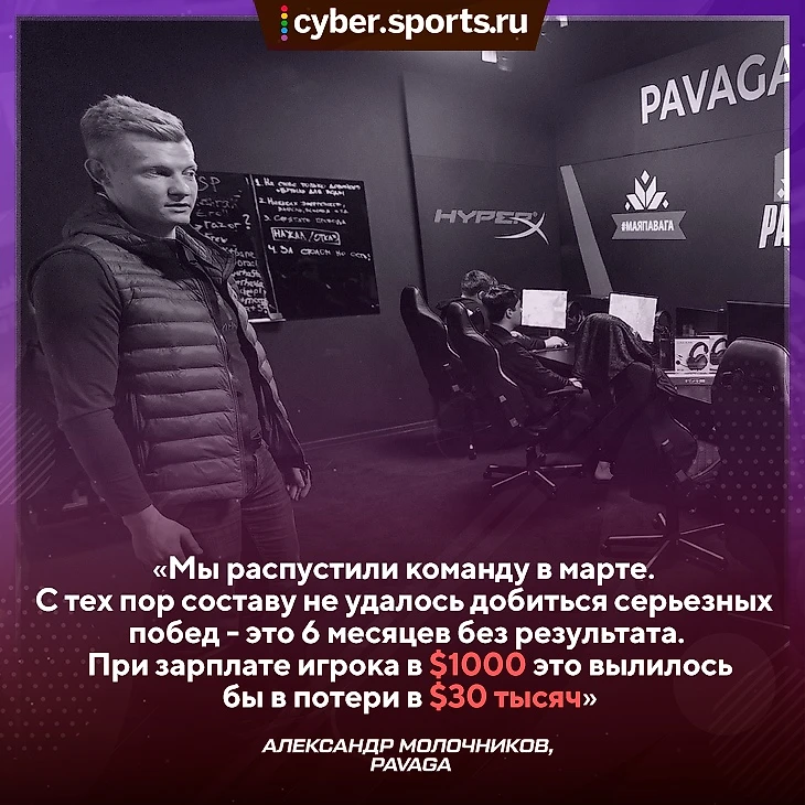 «После победы на турнире от Loot.Bet игроки начали просить повышение зарплаты. Результаты за последние месяцы были хорошие, перспективы виделись радужными, поэтому я согласовал этот момент с инвесторами, — делится CEO клуба Pavaga Gaming Александр Молочников. — Но после последовали полтора тяжелых месяца. Как в результатах, так и в атмосфере внутри команды. Было очевидно, что игроки в тильте, однако они этого не признавали. При этом некоторые из них продвигали идею, что организация должна быть довольна имеющимся составом, платить зарплату и не вмешиваться в их внутренние дела. Чтобы вернуть команду в строй, мы разработали систему мотивации, которая была основана на результатах, работе с медийкой и командном развитии. Но такой вариант устроил не всех. Да и некоторые из ребят не хотели играть в этом составе.Так как на ближайшие месяцы крупных турниров запланировано не было, мы решили, что формировать новую команду – это слишком дорого и рискованно».