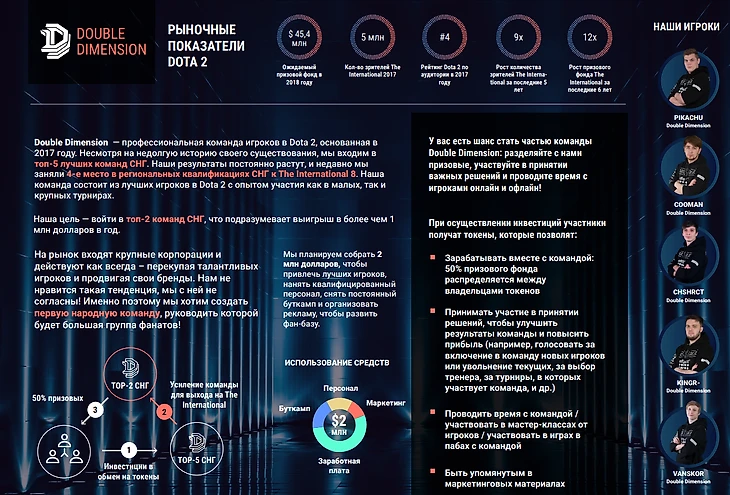 О подобном варианте задумывались и в СНГ. Юрий Федин, генеральный директор Double Dimension, в 2018 году предлагал на суд сообщества проект краудфандинга путем ICO. Правда, он не просто хотел собрать деньги с поклонников, а отдать им бразды правления. По планам DD, организация могла создать состав топового уровня и конкурировать за высокие позиции в регионе. Но после изучения реакции и комментариев, Федин пришел к выводу, что и в СНГ такой проект реализовать невозможно.