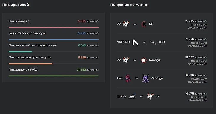 А в это время за сезон в Европе и СНГ прошло меньше десятка турниров с призовым больше $10 тысяч. Среди них есть и чемпионаты от WePlay, которые стали легкой наживой для тир-1 составов. Но главное — они собирают невероятно мало зрителей, а значит, мало что приносят организациям. Европейский BTS Cup весной в среднем смотрели меньше 12 тысяч человек, а Qi Invitational Europe — всего 3,5. Клубам важны скорее показатели на трансляциях, чем призовые.