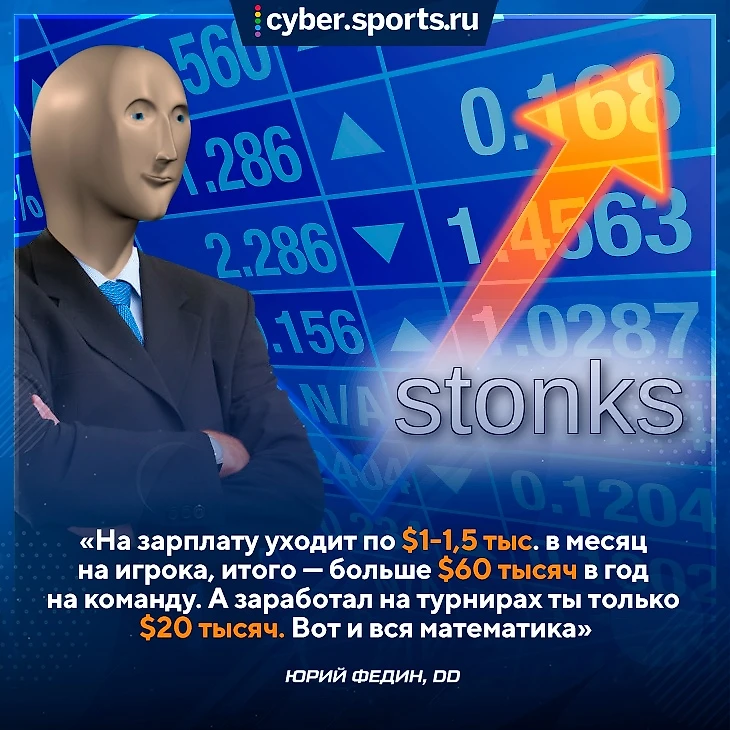 «В Dota 2 нет лифта между тир-4 и тир-1 турнирами. Многие пытаются проводить небольшие чемпионаты, но пока это развивается недостаточно быстро. Призовые-то достаются игрокам, — разъясняет Юрий Федин из DD. — Допустим, ты как организация поучаствовал в 10 турнирах, заработал там $100 тысяч. А сколько из этого действительно получил клуб? Правильно, от 10 до 30%. А это $10-30 тысяч& На зарплату уходит по $1-1,5 тысячи в месяц на игрока, итого — больше $60 тысяч в год на команду. А заработал ты только $20 тысяч. Вот и вся математика».