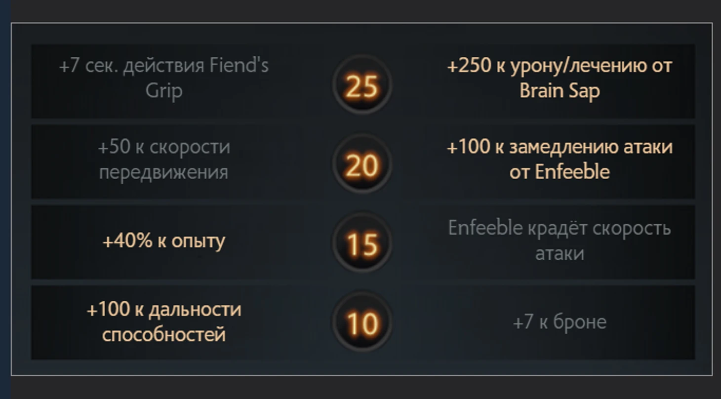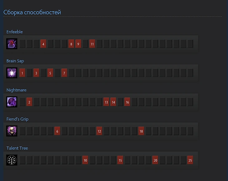 Ни при каких обстоятельствах вам не следует изучать никакой другой скилл, кроме Brain Sap! Данную ошибку совершают достаточно много игроков на Bane. Единственное условие, при котором стоит изучить Nightmare, это если данное умение поможет вашей команде не только забрать Руну Богатства, но при этом так же пролить Первую Кровь. Причина, по которой стоит изучить Brain Sap на первом уровне очень проста - данная способность необходима, чтобы оказать максимум давления на вражеских героев. Если вы дадите им свободно качаться на линии в самом начале, потом вам будет очень сложно их остановить. Бейн должен начать доминировать свою линию как можно раньше.