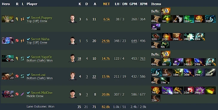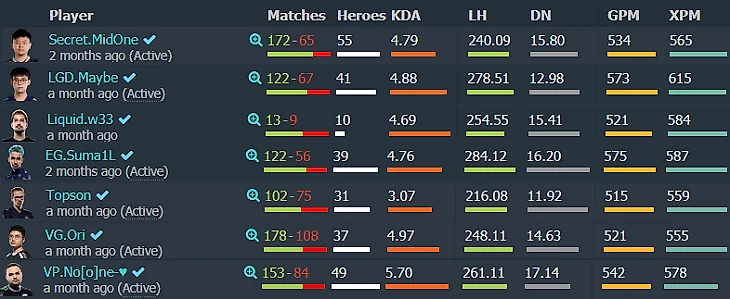 При аномальном для любой команды, кроме Secret, винрейте (72,6% - у ближайшего преследователя, Сумаила, 68,5%), у MidOne довольно низкие средние показатели. Во-первых, он не боится экспериментов – пусть и не всегда удачных (раз, два). Во-вторых, он не из тех мидеров, что выносят оппонента на линии и идут феерить в одиночку: никто из мидеров в тир-1 командах не жертвует так собой ради команды.