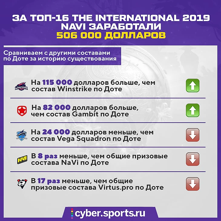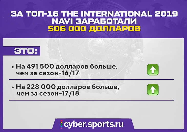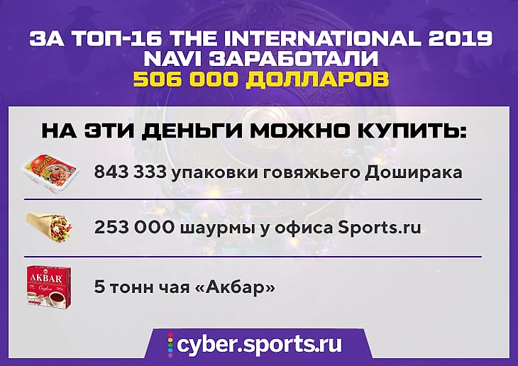 Парни не смогли взять ни одного матча в плей-офф и завершили The International 2019 на 16-м месте – ниже только две команды, которые заняли последнее место в группе. Если вы считаете, что это слишком низкая позиция, то посмотрите на итоговые призовые. 506 тысяч долларов – это больше, чем у NaVi за целые сезоны и некоторых СНГ-команд за все время существования. Кстати, российская команда Virtus.pro за 12-е место получила ненамного больше – 685 тысяч.