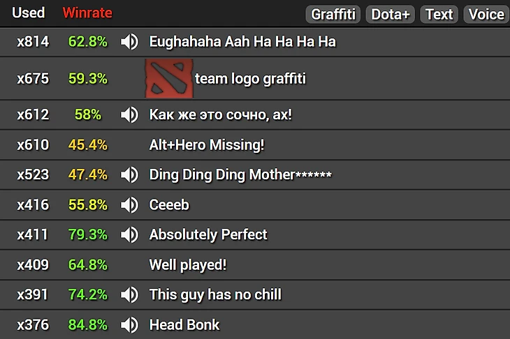 Вот топ-10 используемых фраз на TI9 с их винрейтом: