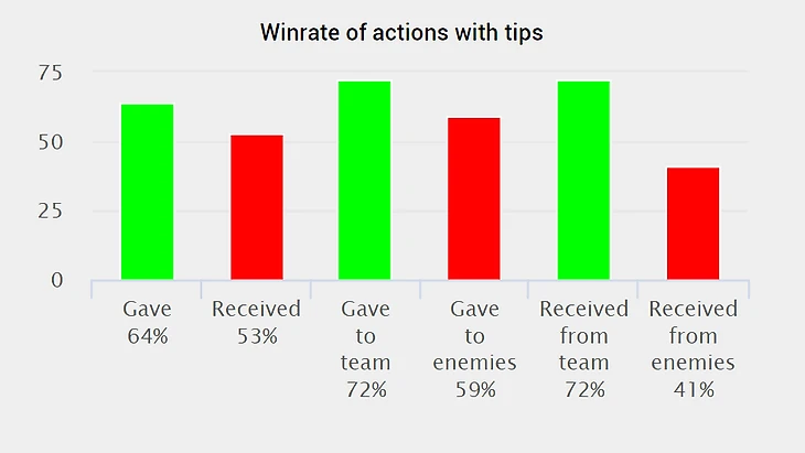 Тимбилдинг превыше всего. Те, кто типают союзников, имеют наивысший винрейт – 72%; при этом те, кто получает типы от соперников, имеют мало шансов на победу, всего 41%.