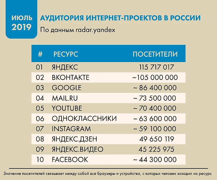 Согласно статистике radar.yandex, «Дзен» занимает 8 строчку в рейтинге интернет-проектов в России в июле 2019 года. Стоит отметить, что Аудитория «Дзена» в России больше, чем у Facebook. Но кто же все эти почти 50 миллионов человек?